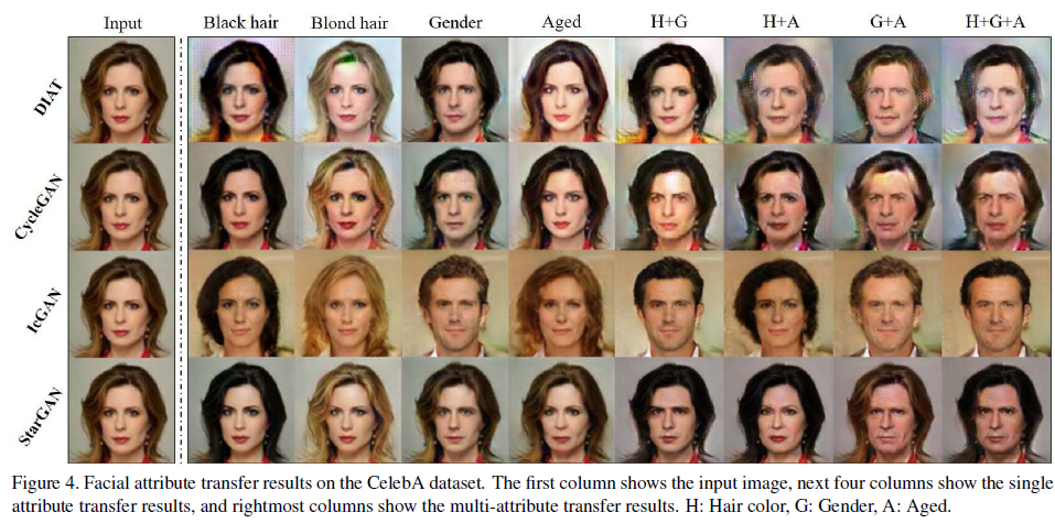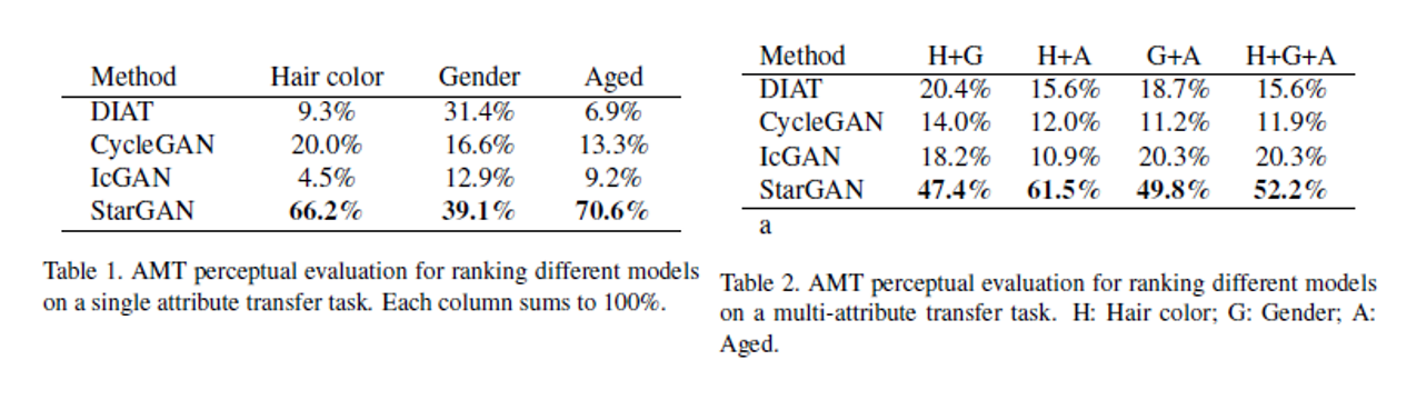 single attribute transfer 중 gender의 경우에는 DIAT이 StarGAN에 견줄 만한 성과를 보였으나, mutliple transfer로 갈 경우에 StarGAN이 압도적인 결과를 보여줌.