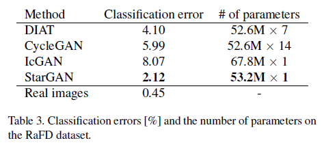 StarGAN이 다른 모델에 비해 낮은 error를 보여줌. 실제 이미지에 학습시킨 결과와 가장 가깝다. 또한, 파라미터 수도 나머지 모델에 비해 현저히 낮기 때문에 high scalability를 보여줌.
