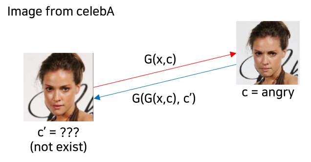 이렇게 될 경우, reconstruction 시 $c'$이 존재하지 않는 문제가 발생하게 됨. 예컨대, celebA처럼 facial attributes만 존재할 경우에는 표정과 관련된 source domain인 $c'$인 reconstruction error 계산이 안되기 때문에 facial expressions translation을 학습할 수가 없음. (아래 그림 참고)