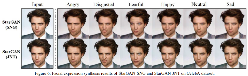 e.g.) joint training을 통해서 RaFD에서 학습한 facial expression 관련 feature들을 활용해서 CelebA images에서 facial expression을 합성할 수 있음.