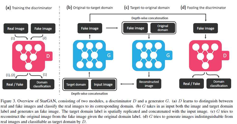 → How?- 모델의 입력으로 이미지와 도메인 정보 두 개를 넘겨주는 방식. 이후, input image를 그에 상응하는 도메인으로 translate하는 식으로 학습하게 됨.