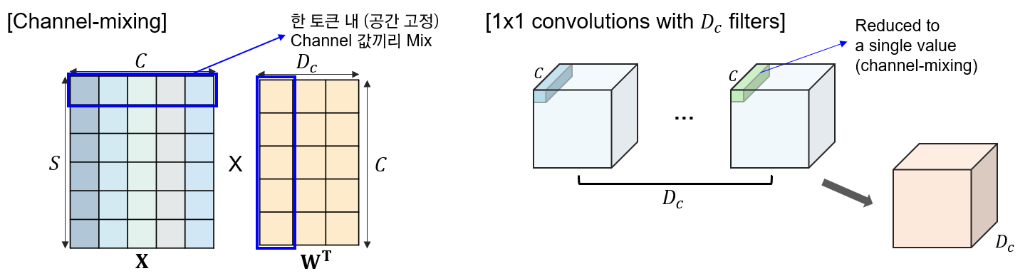 channel mixing의 경우 1x1 convolution을 사용하는 CNN과 동일하다.