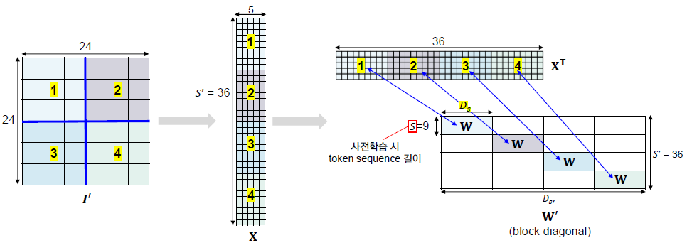 이에 대한 token mixing mlp의 weight $W'$의 경우, $S'\times D_{s'}$의 matrix이다. 이때 $W'$의 block diagonal (각 block diagonal의 크기는 $9 \times D_s$ 이다)에 기존의 weight matrix인 $W$을 채움으로써 Fine-tuning 시 weight matrix의 조정이 이루어지게 된다.