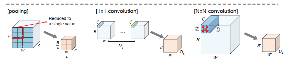 CNN의 경우에는, NxN (N > 1) convolutions과 pooling을 통해서 다른 spatial locations 간의 특징을 섞고 (2를 수행) 1x1 convolutions를 통해서 주어진 공간적 위치 안에서 특징을 섞는다 (1을 수행). 이외에 1보다 크기가 더 큰 커널을 이용한 convolution은 1)과 2)를 동시에 수행한다 (채널 차원도 변경되고 spatial resolution도 변경).