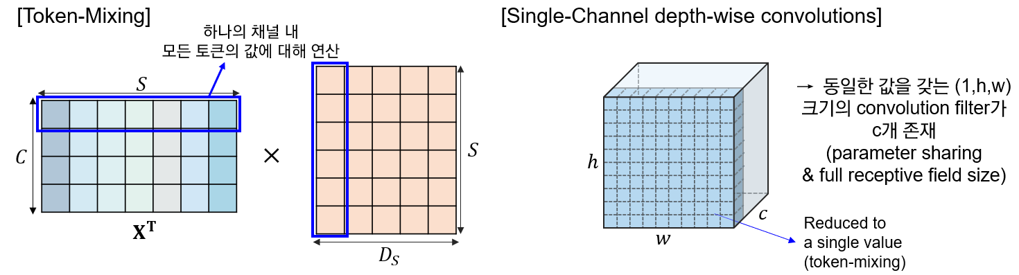 Single-Channel Depth-wise Convolutions의 경우에는 각 채널 별로 독립적으로 convolution이 적용된다. token mixing의 경우에는 모든 토큰 (전체 이미지 패치)의 한 채널 값에 대해서 연산이 이루어지기 때문에 full receptive field의 single-channel depth-wise convolutions라고 할 수 있다.