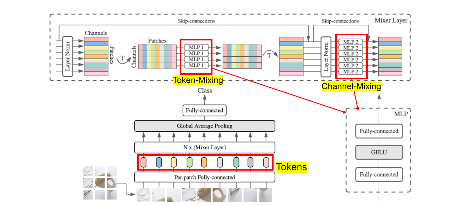 - Token-Mixing MLPs: MLPs applied across patches ("mixing" spatial information)