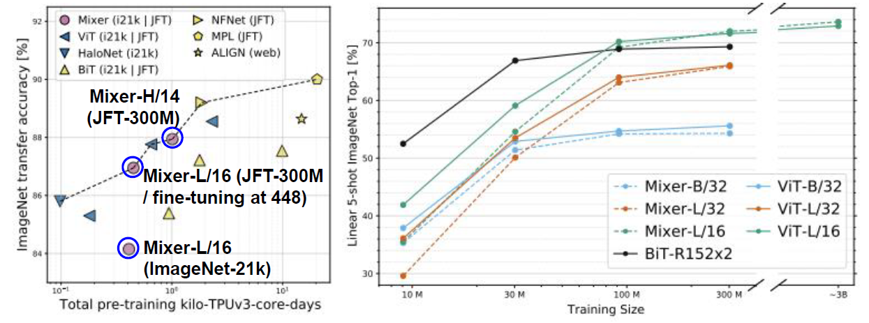 (우측) Mixer가 사전학습 데이터셋 크기가 작을 경우 더 낮은 성능을 보여주었으나, 크기가 커질 수록 타 모델 대비 성능 증가 폭이 매우 큼을 알 수 있다. 또한, 데이터셋 크기가 3억장~30억장이 될 경우에는 기존 SOTA인 ViT에 필적하는 정확도를 보여주었다.