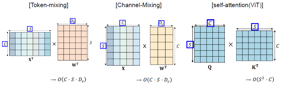 token mixing mlp의 경우에는 각 토큰의 특정 채널 값 간 연산이 이루어지기 때문에, 하나의 채널 내 모든 토큰의 값에 대해 연산이 이루어진다고 볼 수 있다.