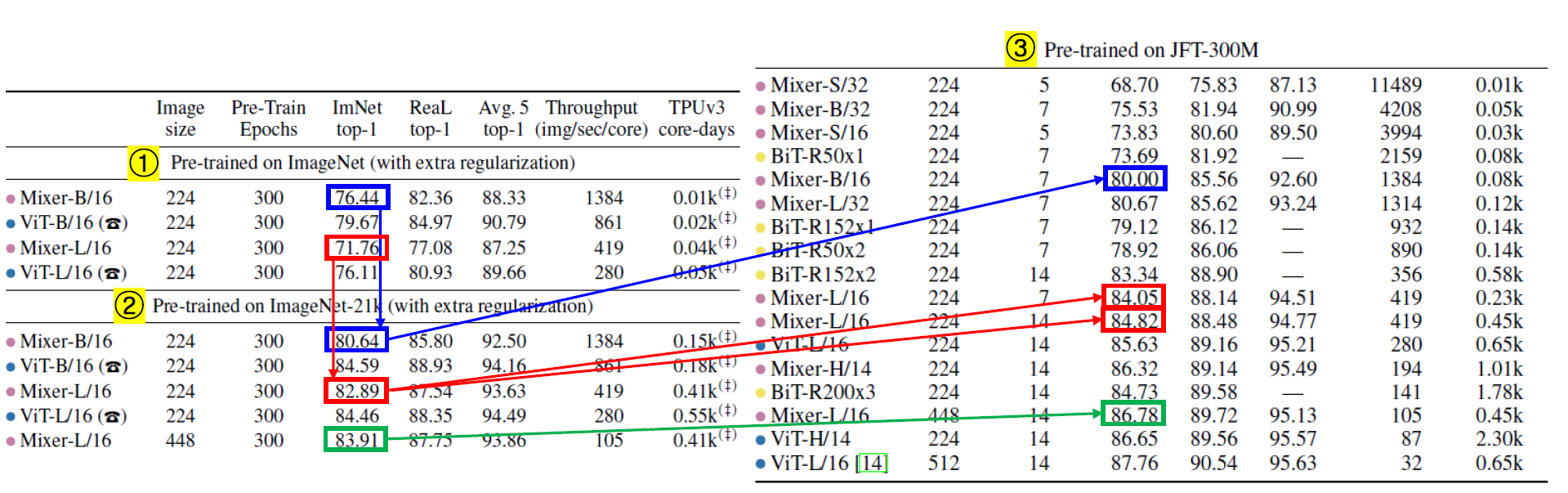 Mixer의 경우에는 일반적인 regularization, optimization을 사용하면서도 큰 크기의 데이터셋에 성공적으로 적용해냈다는 점에서 앞선 fully connected networks 선행 연구보다 의의가 크다고 할 수 있음.