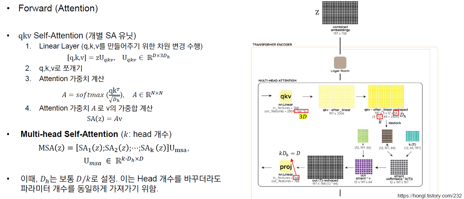 저는 그냥 torch로 reshape을 구현했지만, 다른 코드에서는 einops를 활용해서 보다 쉽게 reshape을 하는 경우가 많았습니다. 구현하실 때 참고하시길 바랍니다. attention 자체는 matrix multiplication과 reshape..의 반복이었습니다. reshape을 하면서 어떤 식으로 텐서가 재구성될지에 대해 약간 확신이 들지 않아서 그런 부분이 조금 어려웠던 것 같습니다. softmax 역시 attention 메커니즘을 제대로 이해하지 못하면 어느 차원으로 적용을 해주어야 하는지에 대해 헷갈릴 듯합니다. 가장 중요한 건, 어쨌든 $(b,n,d)$ 차원을 지속적으로 유지를 시켜주어야 한다는 점입니다. 해당 사항을 염두에 두고 구현하다 보면 헷갈리다가도 갈피를 잡을 수 있는 것 같습니다. (아님 말고..)