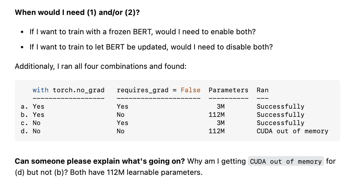 b와 d 옵션을 조금 더 살펴보면, b같은 경우에는 모든 파라미터에 대한 grad 텐서를 저장하게끔 설정이 되어 있지만, 애초에 no_grad context에서는 gradient 계산 자체가 이루어지지 않기 때문에 grad 텐서는 어차피 None이 됨. 따라서, 파라미터 수가 112M로 잡히더라도 메모리 사용량은 줄어들게 됨. d 같은 경우에는, 모든 파라미터에 대한 gradient 텐서도 저장이 되게끔 설정되어 있고 실제로 계산도 모두 이루어지기 때문에 112M개의 파라미터에 대한 gradient를 다 저장해야함. 따라서, OOM error가 발생하는 것.