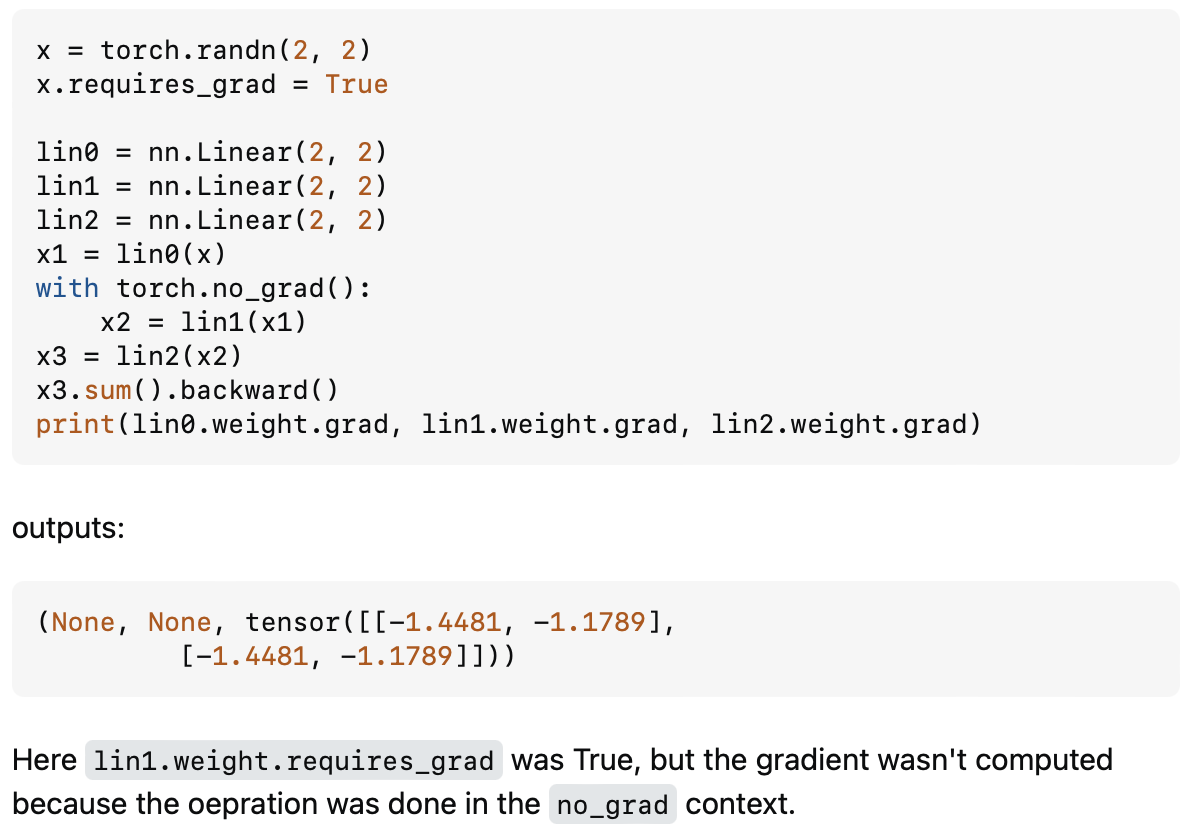 ➡️ 즉, no_grad는 wrapping되어 있는 context에서는 gradient 계산이 이루어지지 않게 되는 것. requires_grad는 grad 텐서를 물리적으로 저장하느냐 아니냐에 대한 여부인 듯함. 계산을 하더라도 물리적으로 저장이 안될 수는 있고 계산을 하지 않더라도 물리적으로 저장은 될 수 있음 (이때는 empty tensor이니 정확히 물리적인 공간 할당이 되느냐 안되느냐의 문제 아닐까 싶음. 실제로 테스트해보니까 아무것도 출력을 하지 않긴 하는데 정확히 메모리공간이 할당이 안되는 건지 뭔지는 잘 모르겠음.)