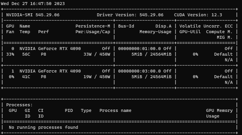 nvidia-smi 명령어 실행 시 성공적으로 출력됨.