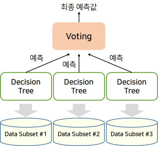 Bagging의 대표적인 알고리즘은 랜덤 포레스트로, Decision Tree 모델을 기반 모델로 삼아서 bootstrapping 분할 후 예측치를 결합한다.