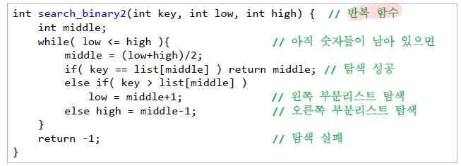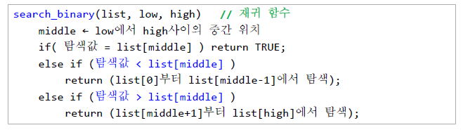 이진탐색은 배열의 중앙값(median)을 조사하여 찾고자 하는 항목이 왼쪽 또는 오른쪽 부분 배열에 있는지를 알아내어 탐색의 범위를 대략 반으로 줄여가며 재귀적으로 진행하는 알고리즘이다(물론 반복으로도 구현 가능하다). 정렬된 배열에서의 탐색에 적합한 알고리즘이다(연결리스트에서는 부적합함. 가운데 지점을 빠르게 찾을 수 없기 때문이다).
