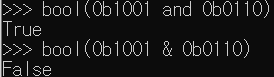같은 and이지만 비트 and는 비트 별로 진행되기 때문에 0000이므로 False로 나오고 논리 and는 뒤의 것을 리턴(파이썬에서 논리 연산자의 경우 마지막에 평가를 한 operand 값이 리턴된다.)