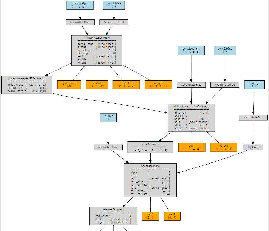 다음은 torchviz를 이용하여 위의 Test 클래스의 forward를 시각화한 것이다. 이를 확인해보면, AccumulateGrad가 적용되는 연산은 해당 연산이 그래프의 leaf node (더이상 backward 상에서 뻗어나가는 가지가 없음. 즉, forward 상에서 들어오는 가지가 없음) 임을 알 수 있다. 반면, 아까 내가 구하고자 했던 feature map (여기서는 UpsampleNearest2dBackward 정도..) 은 forward path 상 들어오는 가지와 뻗어나가는 게 존재한다. 즉 "intermediate variable"이다.