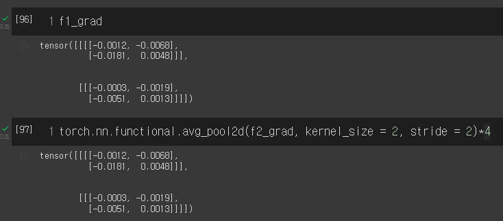 실제로 f2_grad, 즉 dl/d(upsampled)를 각각 2x2 sum pooling을 진행한 결과, f1_grad와 동일한 결과를 내는 걸 알 수 있었다.