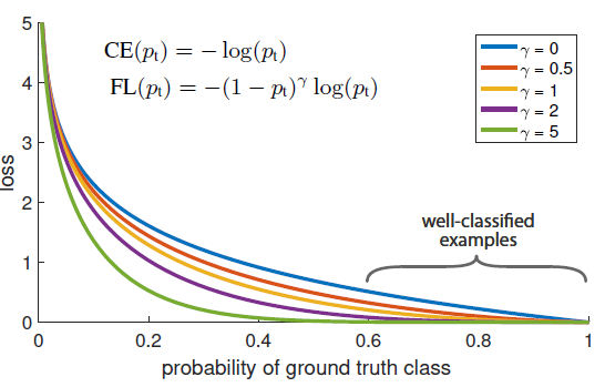 - $FL(p_t) = -\alpha_t(1-p_t)^\gamma\ log(p_t)$