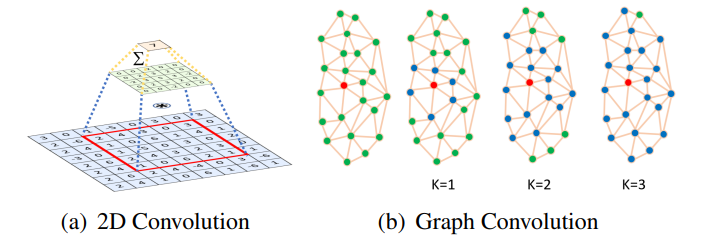- 2D convolution operation → kernel-weighted neighbor sum within the Euclidean grid receptive field