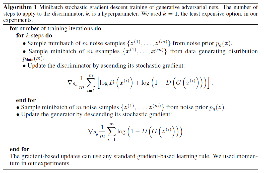 Generator는 random input을 받고 생성을 하고, discriminator는 생성된 이미지와 진짜 이미지를 인풋으로 받아서 해당 샘플이 진짜인지 아닌지 판별하게 됨. 이후 discriminator loss를 계산 후, k번 gradient ascending을 수행하고 그 후에 generator는 generator loss를 계산 후 gradient descent 수행.