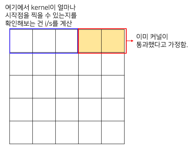 그렇다면 왜 이미 k를 빼줌으로써 이미 한 번 커널이 step을 밟았다고 해주는 걸까요? 이러한 가정이 없다면 kernel이 움직일 수 있는 공간은 (i-k+1)입니다. 이렇게 될 경우, i-k+1 = 3(이번에는 k=3으로 생각해봅시다)이 되고 이를 s=2로 나누어주면, 1.5가 나오기 때문에 floor function을 적용하면 1이 됩니다. 그러나 실제로 커널은 1번째 칸, 3번째 칸을 시작점으로 총 2번 step을 밟을 수 있습니다. 이처럼 i-k+1이 s로 나눠떨어지지 않을 경우 floor 처리를 함으로써 -1이 되는 문제를 방지하기 위해 미리 하나를 제해놓는 것입니다.
